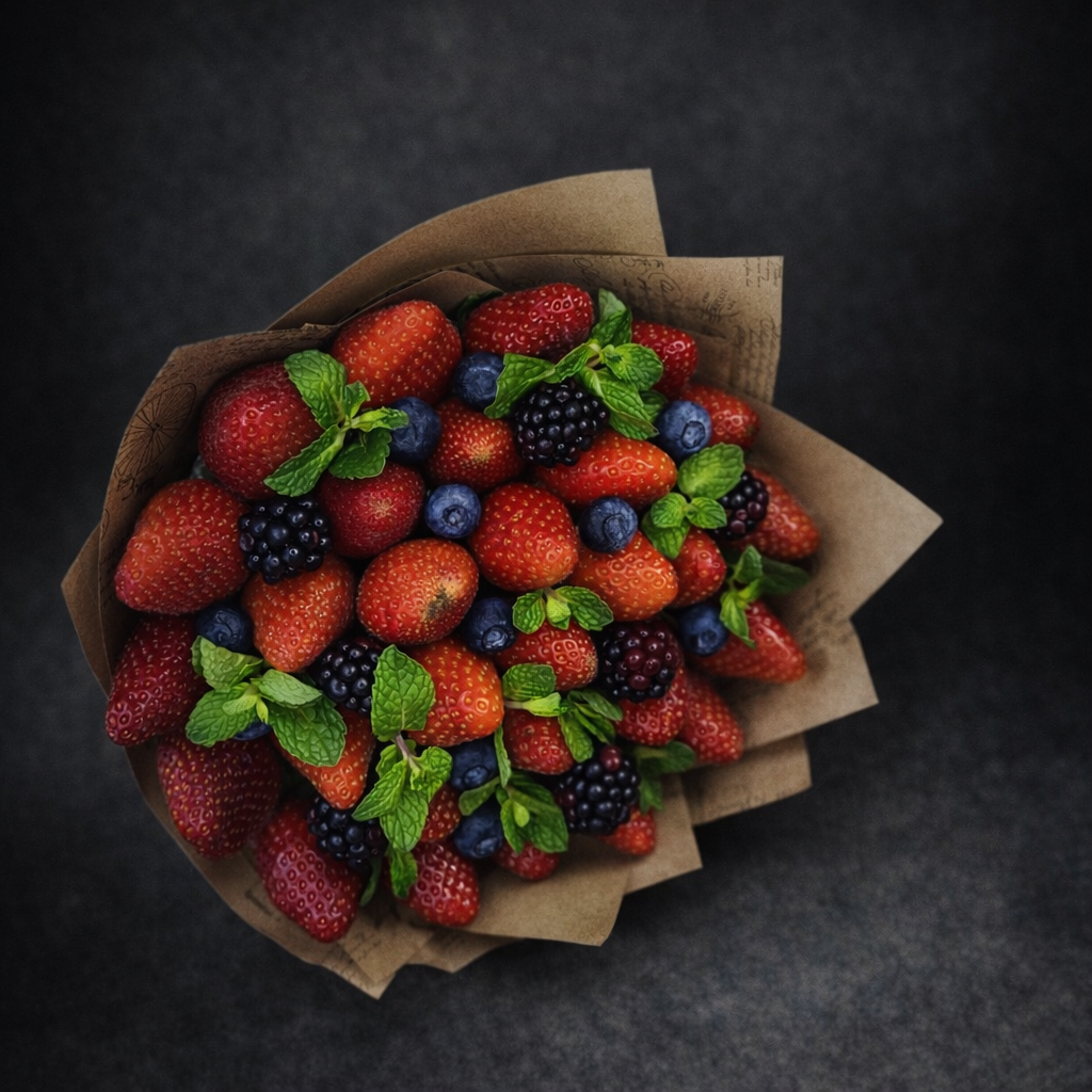 Состав: • Клубника в шоколаде — ~20–25 шт • Декор: шоколадные кранчи, сублимированная малина, инжир • Премиальные посыпки • Общий вес: ~1,2–1,5 кг