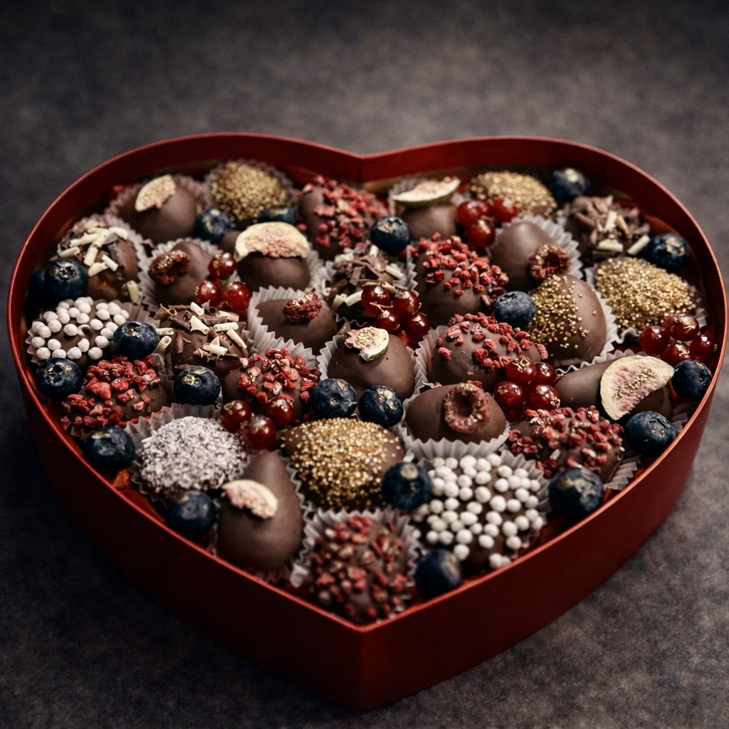 Состав: • Клубника в шоколаде — ~14–18 шт • Декор: сублимированная малина, кокос, шоколад • Общий вес: ~0,8–1 кг